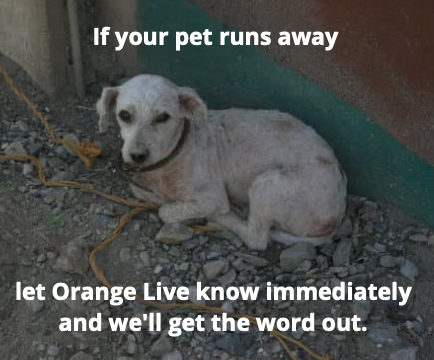 As a local entity, people with fearful pets confidently turned to Orange Live as a resource to help locate their pets when they ran in fear during fireworks displays or thunderstorms. Our success rate at helping find these pets, even a month later stands at about 85%. The sooner we were notified the faster the community response, and better the chance of locating the pet quickly.